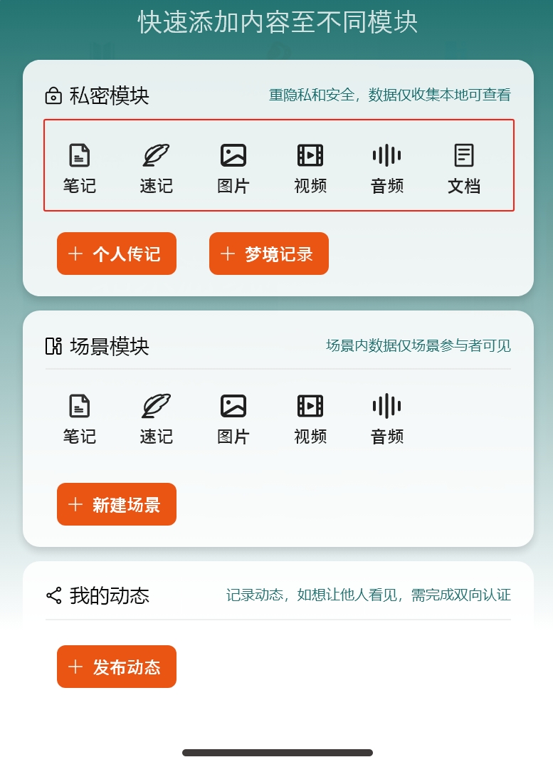 该功能模块内数据为“个人数据”的合集,仅用户手机内可以查看,此模块数据在传输和云端备份存储时,都为纯“黑盒”加密数据,所有人都不可见,绝对安全,用户可根据自己需要,放心使用;