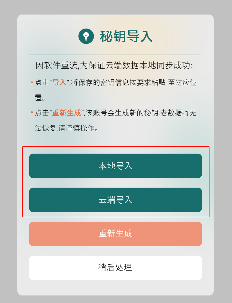 - 软件定期以弹窗形式提醒用户导入秘钥