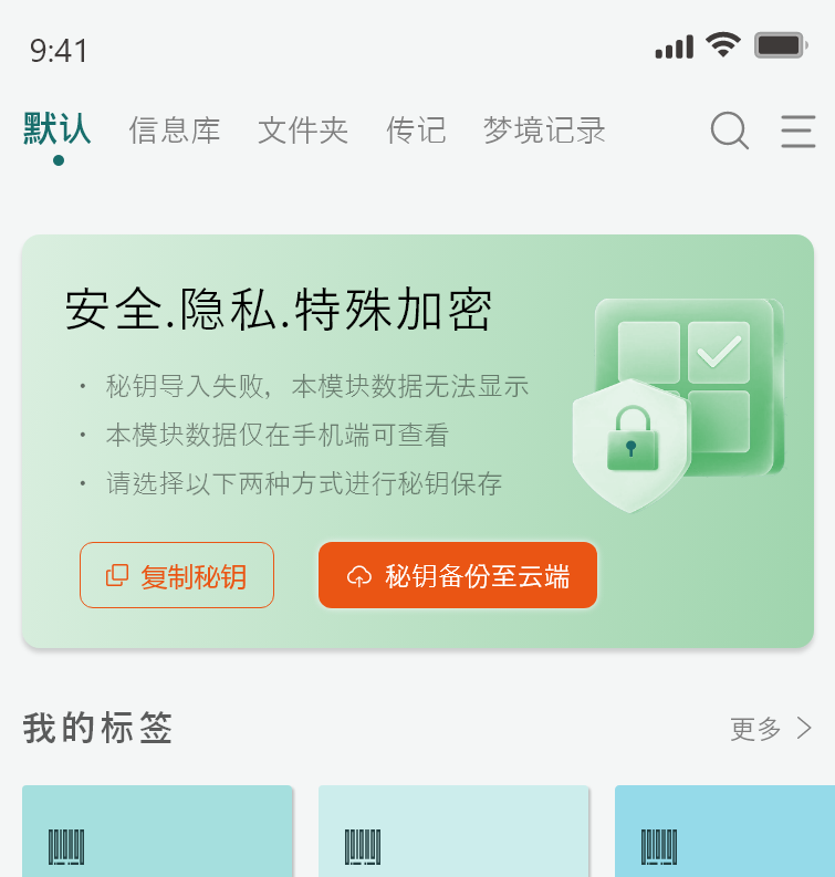 为保证用户数据绝对隐私和安全,我们采用数据本地加密、本地解密、秘钥本地存储的一种特殊加密方式。秘钥文件就好比是用户打开本地信息的的唯一“钥匙”。